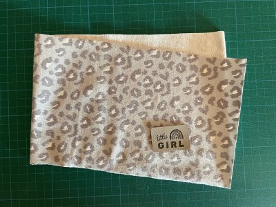 Maintenant, déplie le bandeau et dispose le joliment. Veiller à ce que la couture du bandeau soit en bas avant de coudre l’étiquette. Choisir maintenant un endroit approprié pour l‘étiquette en similicuir « Little Girl » et la coudre à la machine.