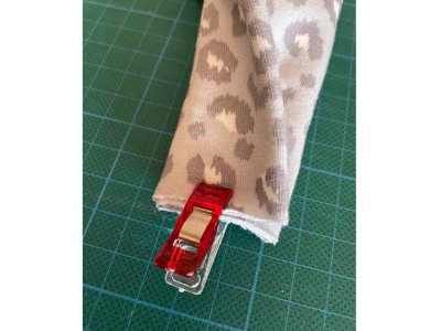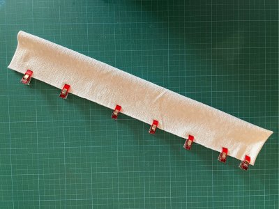 Poser les bords longs du tissu l’un sur l’autre de manière à ce que l’endroit se trouve à l’intérieur et les fixer avec des pinces ou des épingles.