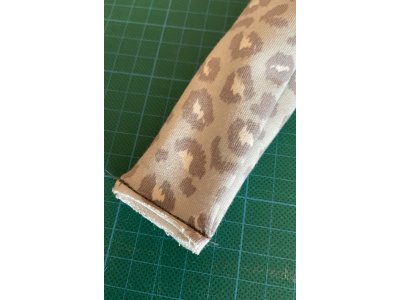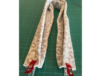 Enlever les pinces et plier la pièce en deux de manière à poser le bord de la partie gauche au milieu de la partie droite (sur le repère). Replier ensuite la partie droite jusqu’au repère du côté gauche. Plier à nouveau la partie gauche sur la partie droite fixer l’ensemble avec une pince ou une aiguille (l’ensemble est donc superposé sur la moitié de la largeur du tube initial).