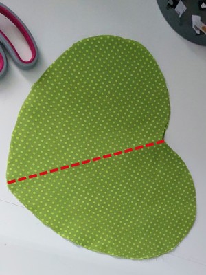 Pour les boucles, repliez chacune des deux bandes de biais de 9 cm au milieu et place-les dans l’un des arrondis supérieurs du cœur.
