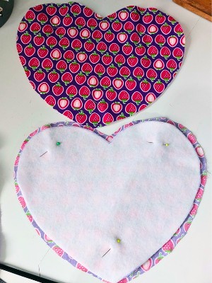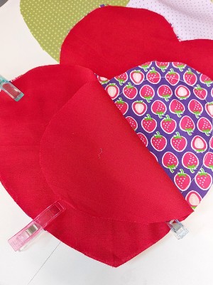 Poser un des cœurs entiers unis sur l’endroit du “tissu fraise” et le fixer avec des épingles. Piquer une fois le tour en laissant une ouverture de retournement d’environ 7 cm.