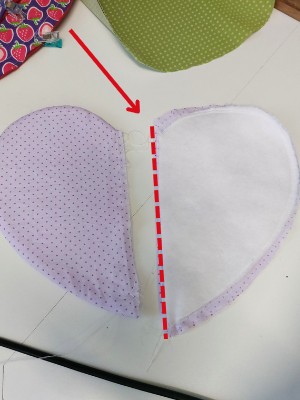 Poser d’abord un demi-intissé sur l’envers d’un demi-cœur à pois, l’épingler et coudre à la machine une fois le long de l’extérieur à bord étroit, de sorte que le tissu et l’intissé soient cousus ensemble