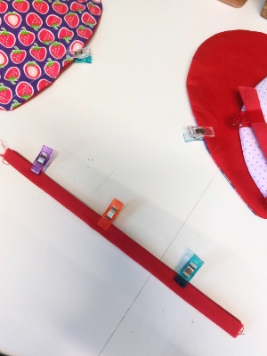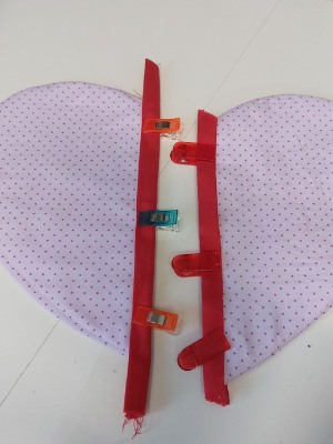Prenez un morceau de tissu de 6 cm de large et de 21 cm de long (pour border une moitié de cœur) – il faudra le faire 4 fois. Pour les boucles, il vous faut 2 bandes de 9 cm.